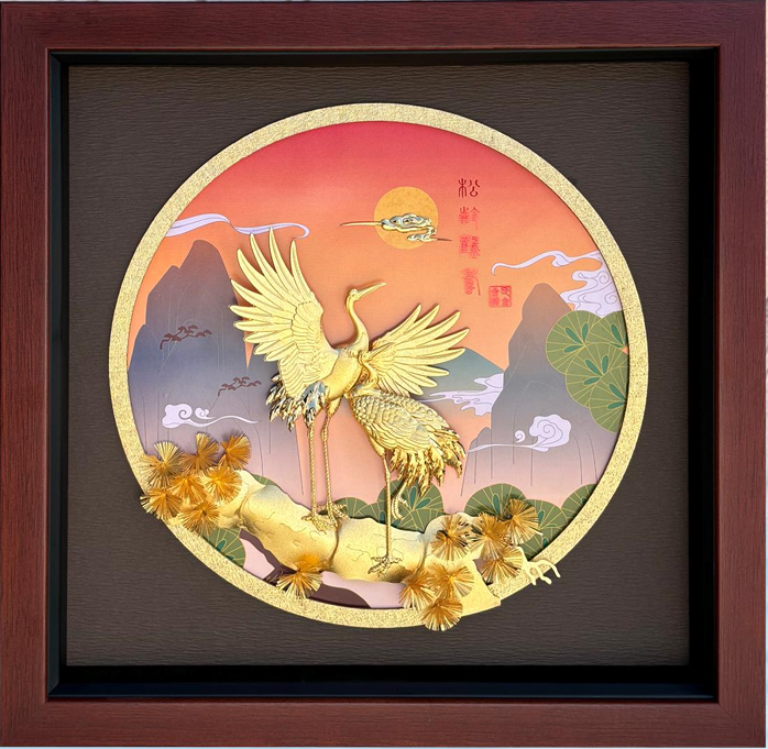 真金箔-松齡賀壽產品外尺寸:300×300mm24 K金箔採用黃金做原材料,經過化滌,捶打等工藝製作成黃金薄片,金箔分為食用金箔和裝飾金箔兩類,黃金含量可達到99.9%,利用黃金原材料,突顯工藝特色。